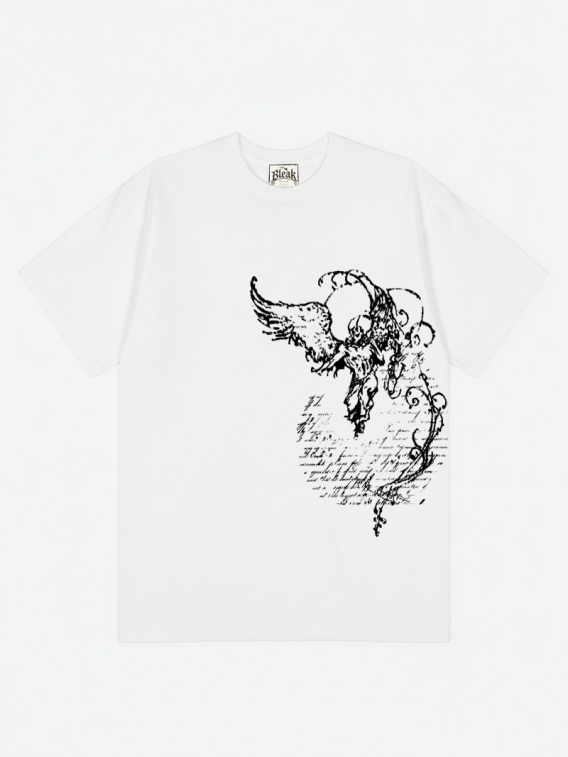 Adore Me to biała koszulka z czarnym, kaligraficznym napisem poprowadzonym pionowo wzdłuż prawej strony.