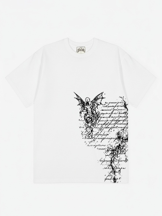 Adore Me to biała koszulka z czarnym, kaligraficznym napisem poprowadzonym pionowo wzdłuż prawej strony.
